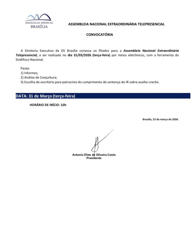 Convocatória – Assembleia Nacional Extraordinária (31/03/2026) Convocatórias Última Atualização em 24 mar, 2026 0 Compartilhar Screenshot 0 Compartilhar FacebookTwitterLinkedinWhatsApp